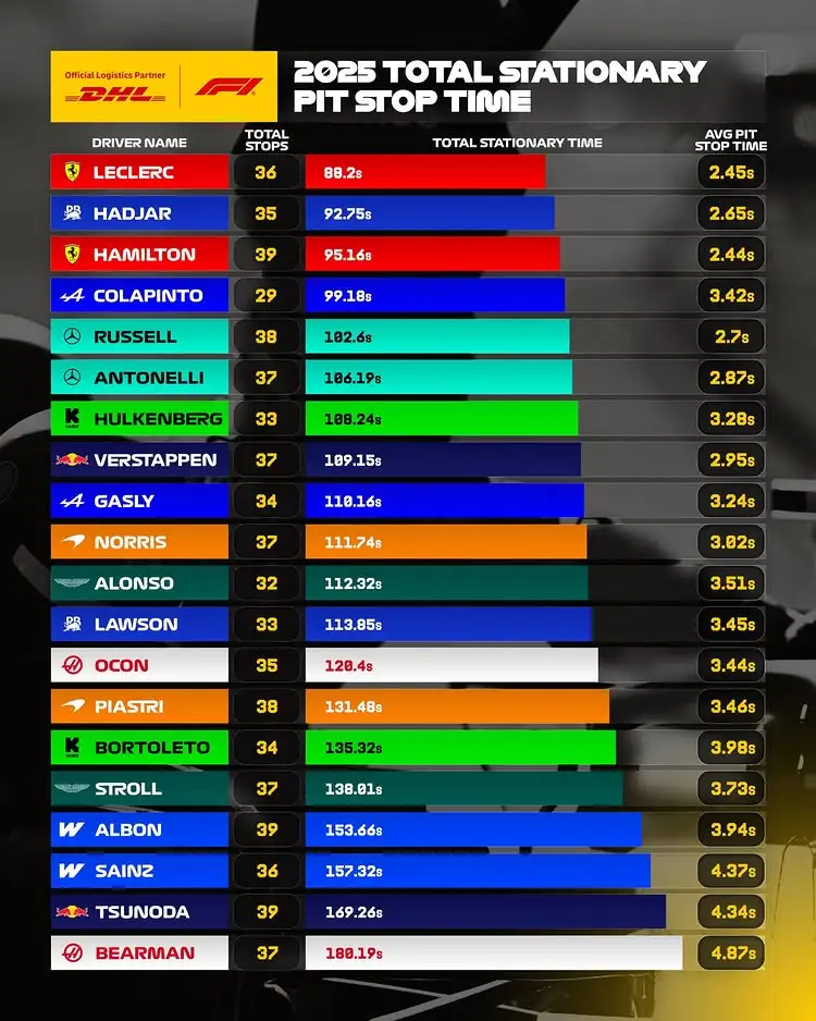 Oliver Bearman dari Haas mencatat total stationary time 180,19 detik—lebih dari dua kali lipat waktu Leclerc—dengan rata-rata pit stop 4,87 detik. Sementara itu, Carlos Sainz bersama Williams membukukan rata-rata 4,37 detik per stop.