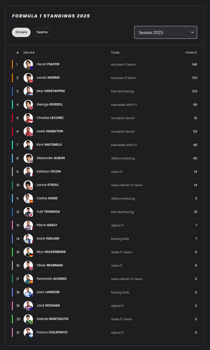 Lando Norris menunjukkan performa stabil di beberapa seri terakhir, membuatnya masuk lima besar klasemen. Oscar Piastri, meski belum menang, terus mengesankan dengan hasil podium di beberapa balapan. McLaren kini menjadi salah satu tim dengan ancaman serius di klasemen konstruktor.
